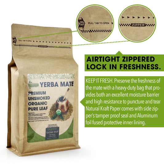 Organic Yerba Mate Tea Loose Leaf 400g (14 oz) Premium Unsmoked Organic Pure Leaf Traditional South American Yerba Mate New Large Leaf Cut No Dusts No Added Stems Loose