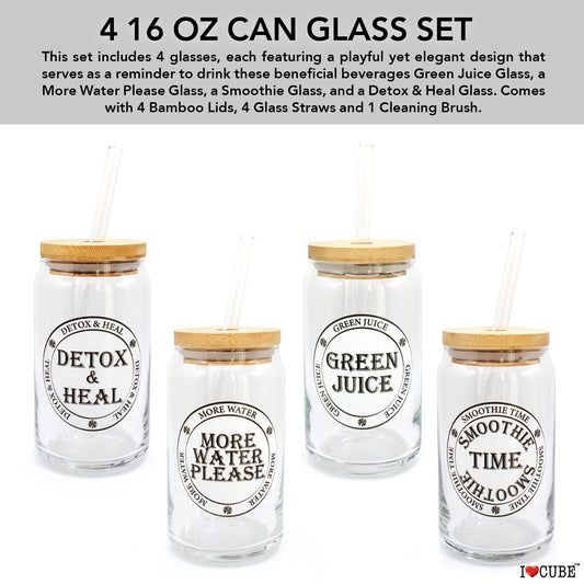 Glass Cups with Lids and Straws 4pcs Set 16oz Can Shaped Glass Cups, Smoothie Cup, Green Juice, Water Cup, Detox Drink Cup, Glass Tumbler, Gift 1 Cleaning Brush